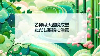 四柱推命 乙卯は大器晩成型、ただし離婚に注意 四柱推命において、乙卯(きのとう・おつぼくのうさぎ)は非常に重要な干支の一つです。この干支は十干の乙と十二支の卯から成り立ち、その性格や運勢には特有の特徴があります。特に乙卯を時柱に持つ人は、大器晩成型の運勢を持ち、晩年に... 2025.06.14 0 四柱推命